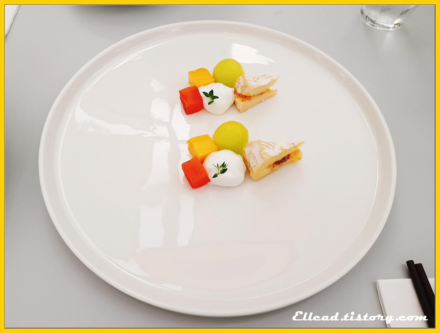 연어, 멜론, 치즈, 그리고 망고로 꾸민 어뮤즈 부쉬