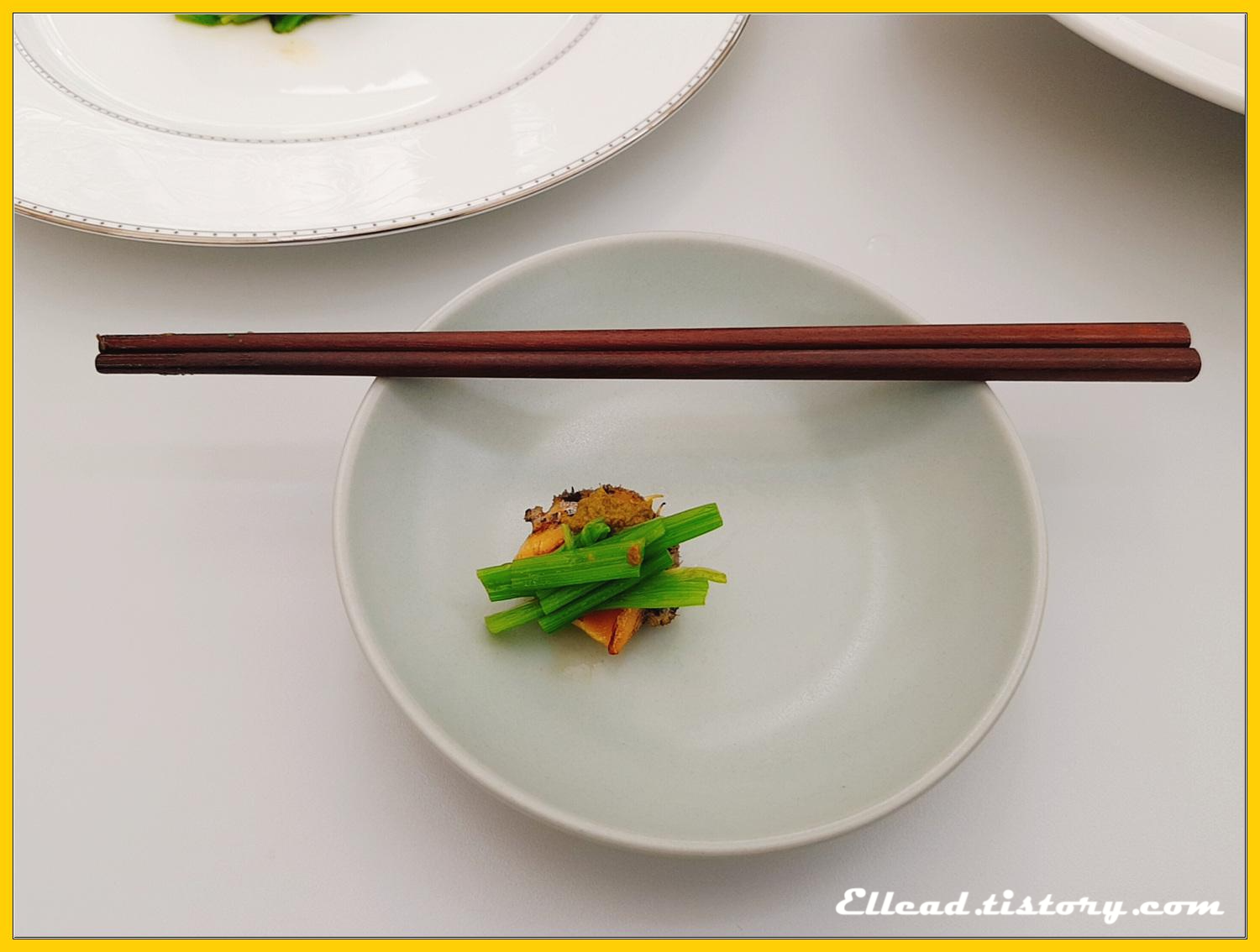 전복과 미나리의 색감이 썩 잘 어울려서 공들여 연출하고 사진을 찍었다, ㅋㅋ.