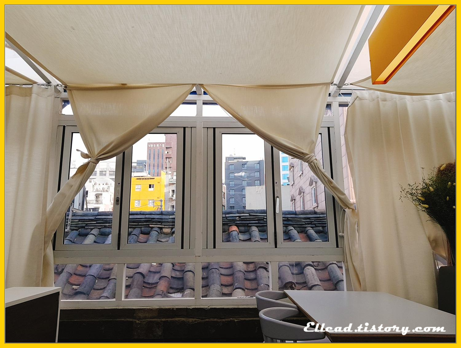 테이블 의자에 앉았는데 눈높이에서 한옥 지붕이 보이는 기이한 경험을 했다. 뭔가 안정감을 해치는 구도인데, 이게 또 이상하게 재미있다.